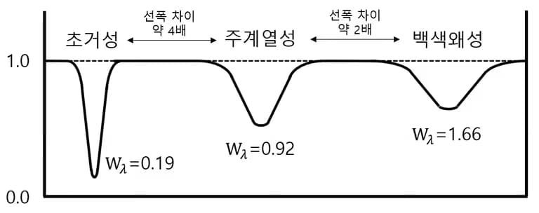 3) 흡수선의 선폭 : 초거성<주계열성<백색왜성