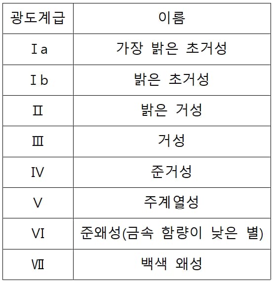 별의 광도 계급은 결국 별의 표면 온도가 같아도 별의 종류가 다를수 있다는 것을 뜻한다.