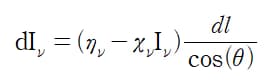 4) 따라서 빛의 광도변화량 = (방출한 정도 - 소광된 정도) * 통과한 거리위의 수식을 아래의 약자로 대체하고 이를 정량적인 수식으로 세워보자.