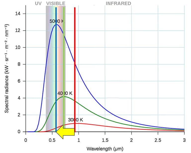 예를들면 절대온도가 5,000k로 일정한 흑체는 가시광선 범위에서 가장 많은 에너지를 방출하고, 자외선이나 적외선에서는 더 적은 에너지를 방출한다.