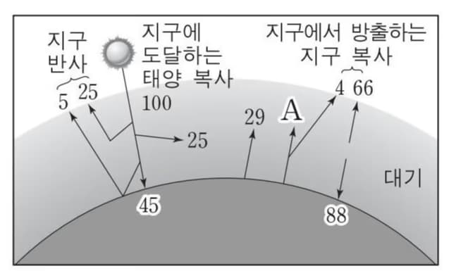 태양에서 지구로 들어오는 태양 복사 에너지의 총량을 100%라고 했을 때, 지구가 완전한 흑체가 아니므로 30% 정도는 구름, 빙하, 모래 등에 반사되고 70%만 흡수된다.