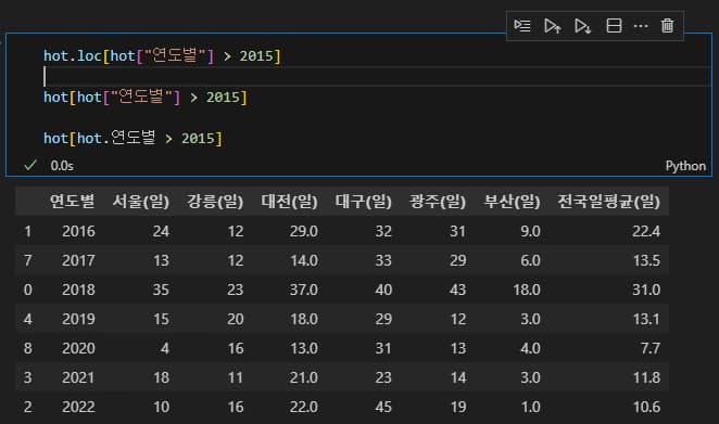 hot_wave.xlsx 데이터 중 폭염 측정년도가 2015년 이후인 데이터만 출력하기